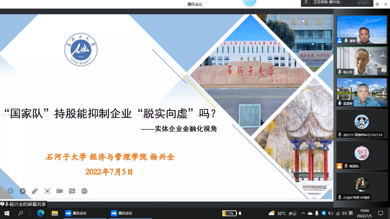202275日上午,会计学院、沁园书院联合主办润泽会计学术名家论坛(第32期)。石河子大学经济与管理学院杨兴全教授应邀为我院师生做了题为“‘国家队’持股能抑制企业‘脱实向虚’吗?”的学术讲座,讲座由会计学院副院长潘俊教授主持。