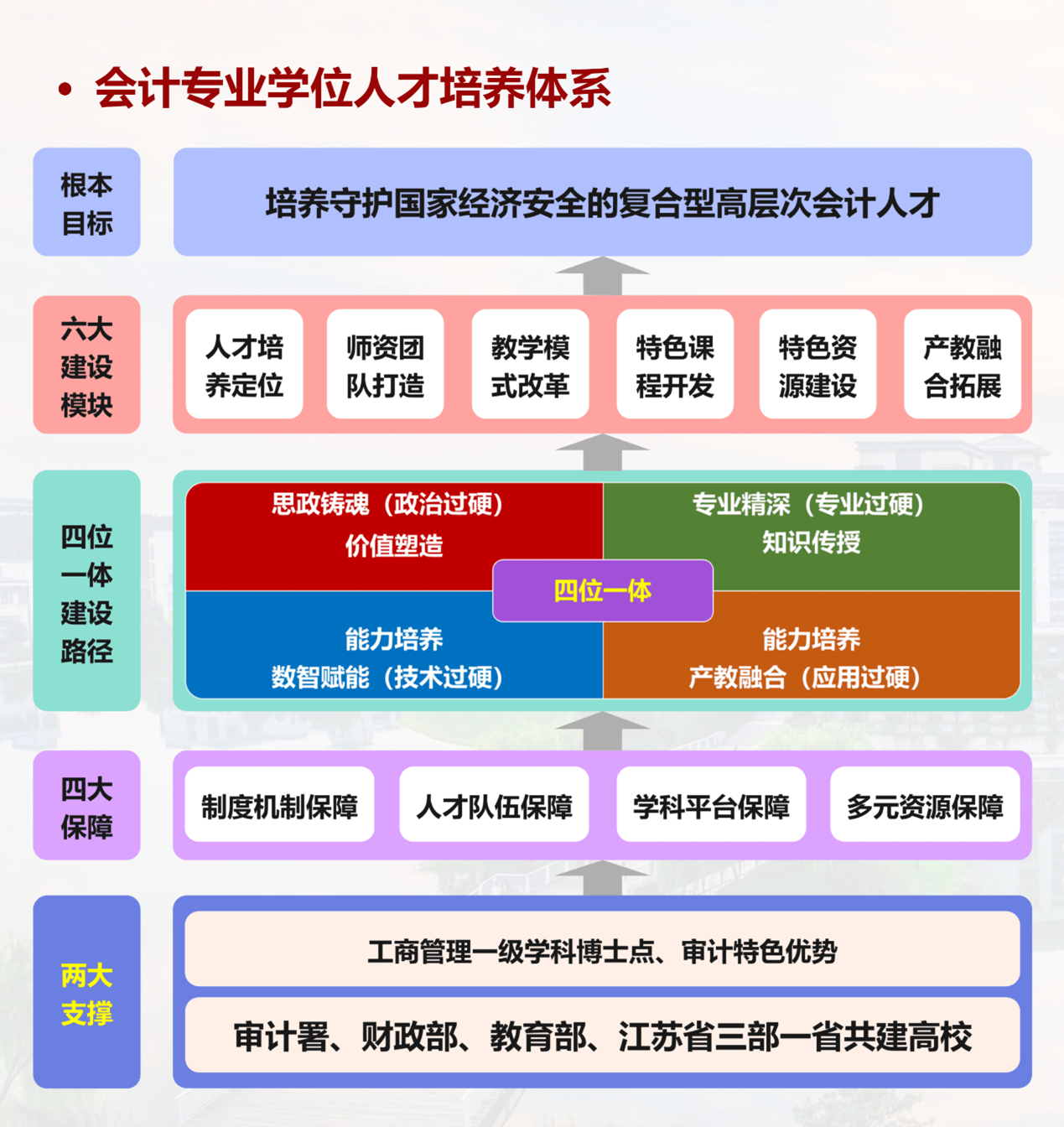本学位点承袭南京审计大学的审计学科优势和多年来会计学科建设成果,坚持走内涵式发展道路,以立德树人为根本、职业需求为导向、提高质量为主线,基于我校服务于审计+经济监督+国家治理的学科布局,对接行业需求,深化产教融合,沿着立德树人+数智赋能+产教融合+财会本色+审计特色的建设路径,聚焦“财会监督与组织治理”,致力于培养德、智、体、美、劳全面发展的智能化、复合型高级财会专业人才。