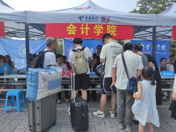 报到现场,会计学院领导和老师为新生热情答疑解惑,志愿者引导新生办理入学手续,迎新工作如火如荼,到处都是忙碌的身影。