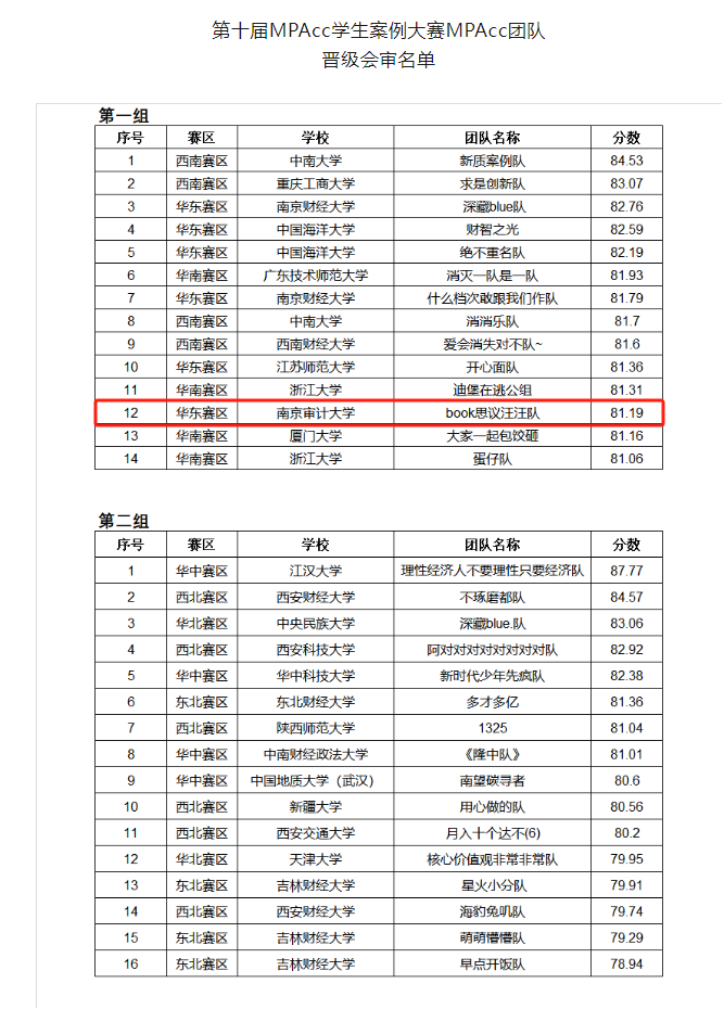 528日,全国会计专业学位研究生教育指导委员会公布了第十届MPAcc学生案例大赛MPAcc团队晋级会审名单。我院MPAcc研究生再创佳绩,由崔秀梅、朱明秀、温素彬老师指导的“book思议汪汪队以第一组第12名的成绩成功晋级会审阶段。