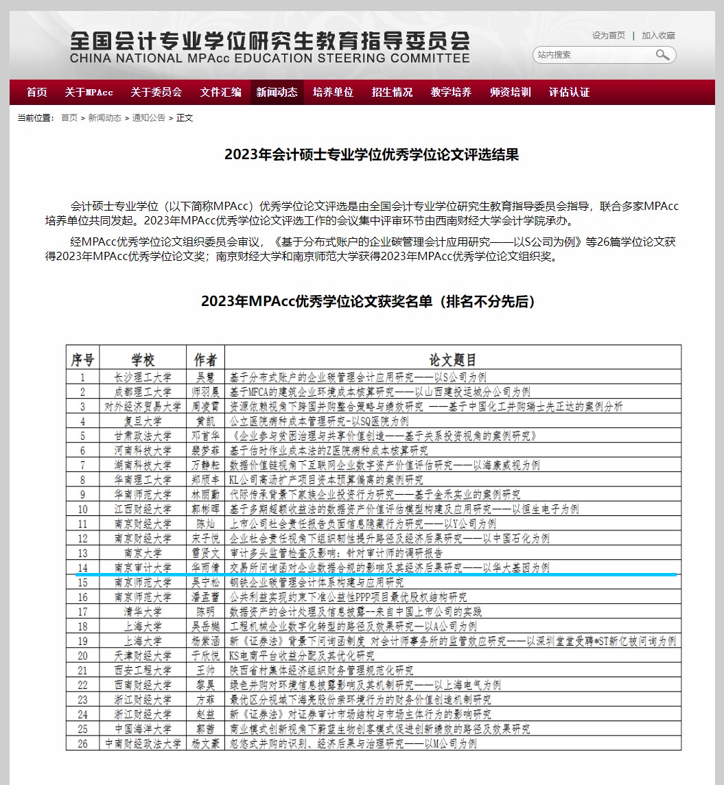 近日,全国会计专业学位研究生教育指导委员会公布了2023年全国MPAcc优秀学位论文评选结果。我院研究生华雨倩撰写的硕士学位论文《交易所问询函对企业数据合规的影响及其经济后果研究——以华大基因为例》(指导教师:王敬勇)位列其中。这是我院MPAcc研究生论文第5次获全国MPAcc优秀学位论文奖。