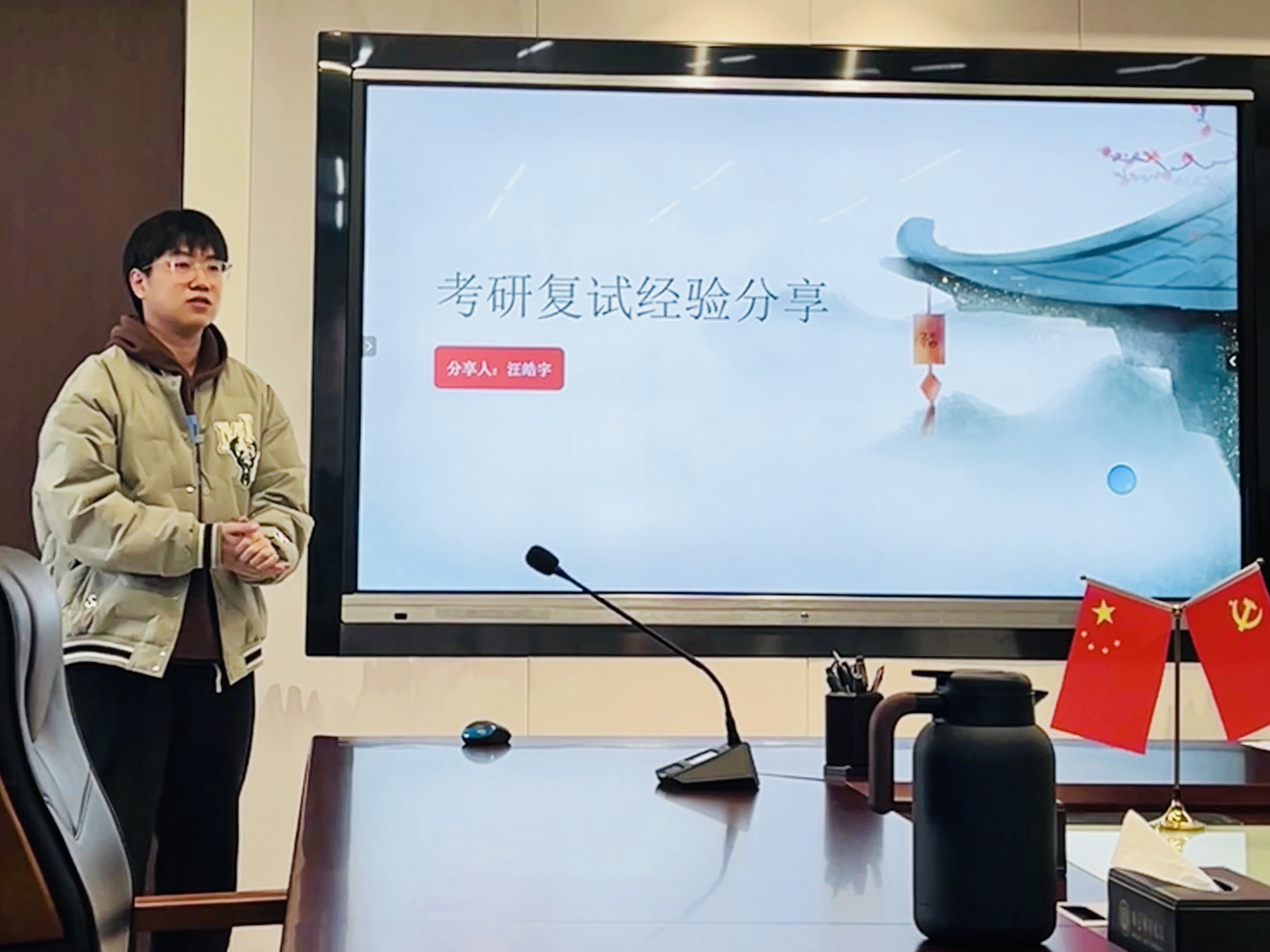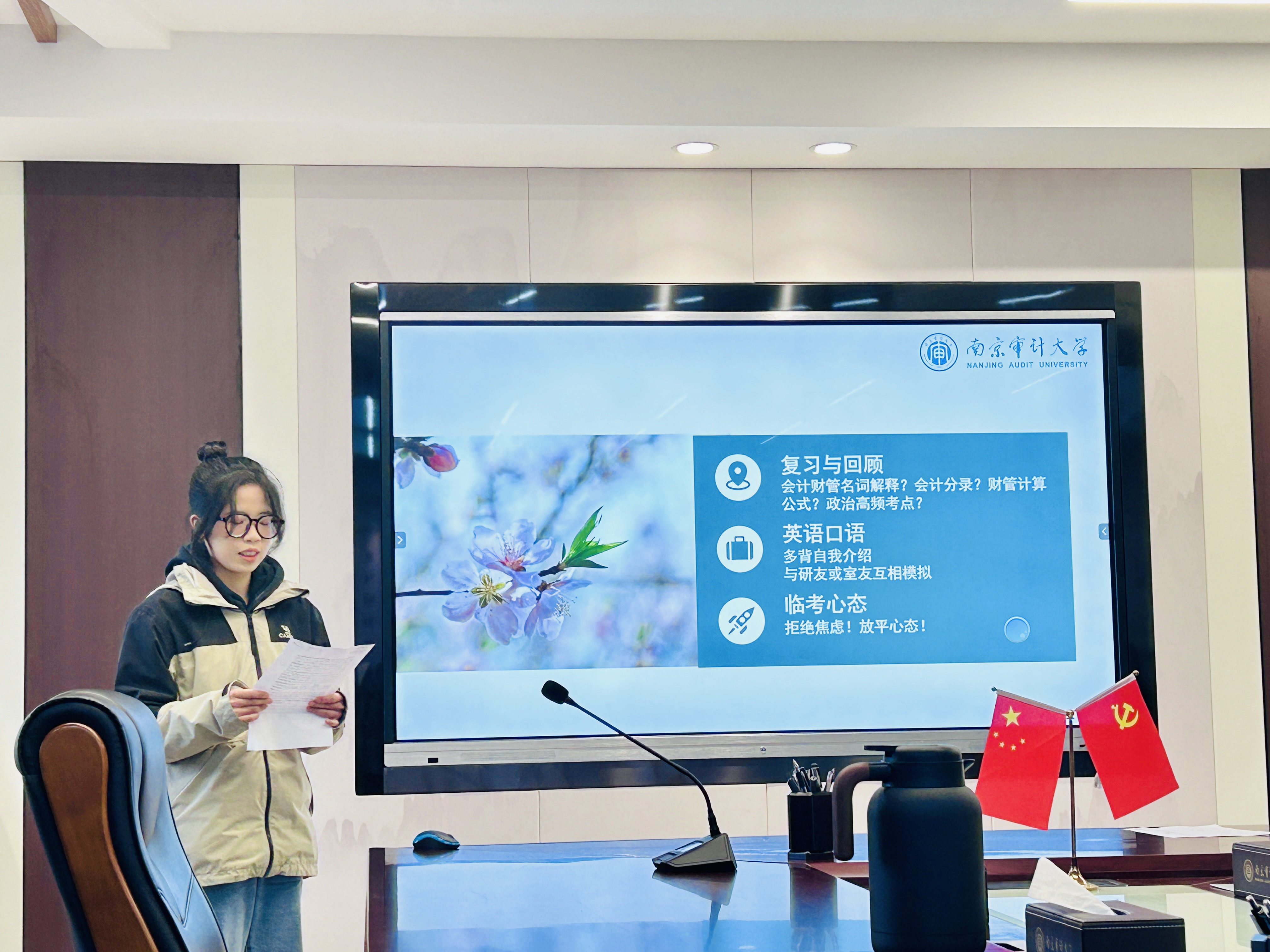 紧接着,南京审计大学研究生会宣传中心干事林洛妤和会计学院研究生第二党支部书记汪皓宇分别从“笔试准备、临场态度、面试技巧”和“专业知识、时事热点、逻辑表达”六个方面为研考同学分享经验;与会的学长学姐与学弟学妹进行了交流与讨论。