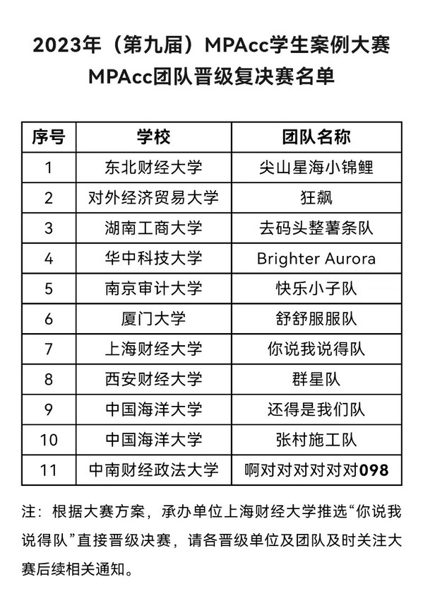 6月5日,2023年(第九届)MPAcc学生案例大赛组委会公布晋级复决赛名单,我校会计专业学位研究生取得了我校历史性突破,由崔秀梅老师、赵娜老师和温素彬老师指导的“快乐小子队”首先在全国3038支研究生参赛队伍中,以不到5%的晋级率中脱颖而出,挺进华东赛区十强,进入全国赛区第二阶段;又在第三阶段全国优胜的150支参赛队伍中突破重围,冲进全国“十强”,勇夺全国复决赛名额,实现了我校零的突破。