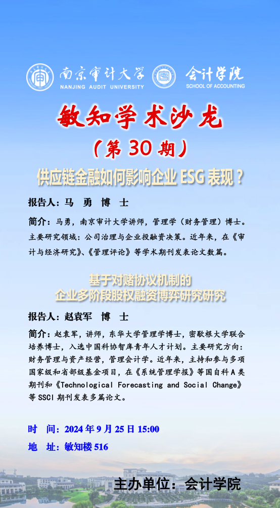 敏知学术沙龙(第 30 期):马勇——供应链金融如何影响企业 ESG 表现?赵袁军——基于对赌协议机制的 企业多阶段股权融资博弈研究研究