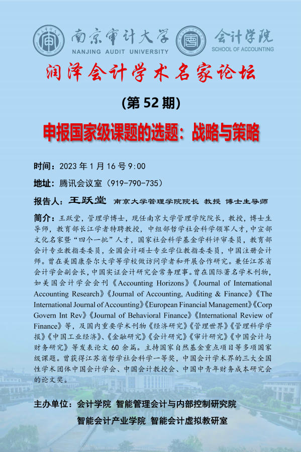 润泽会计学术名家论坛第52期:王跃堂——申报国家级课题的选题:战略与策略