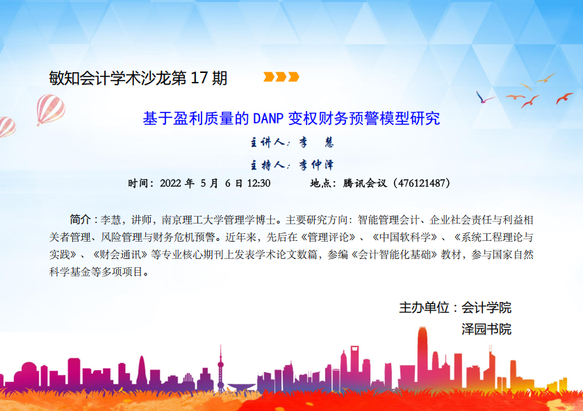 敏知会计学术沙龙第17期:李慧-基于盈利质量的DANP变权财务预警模型研究