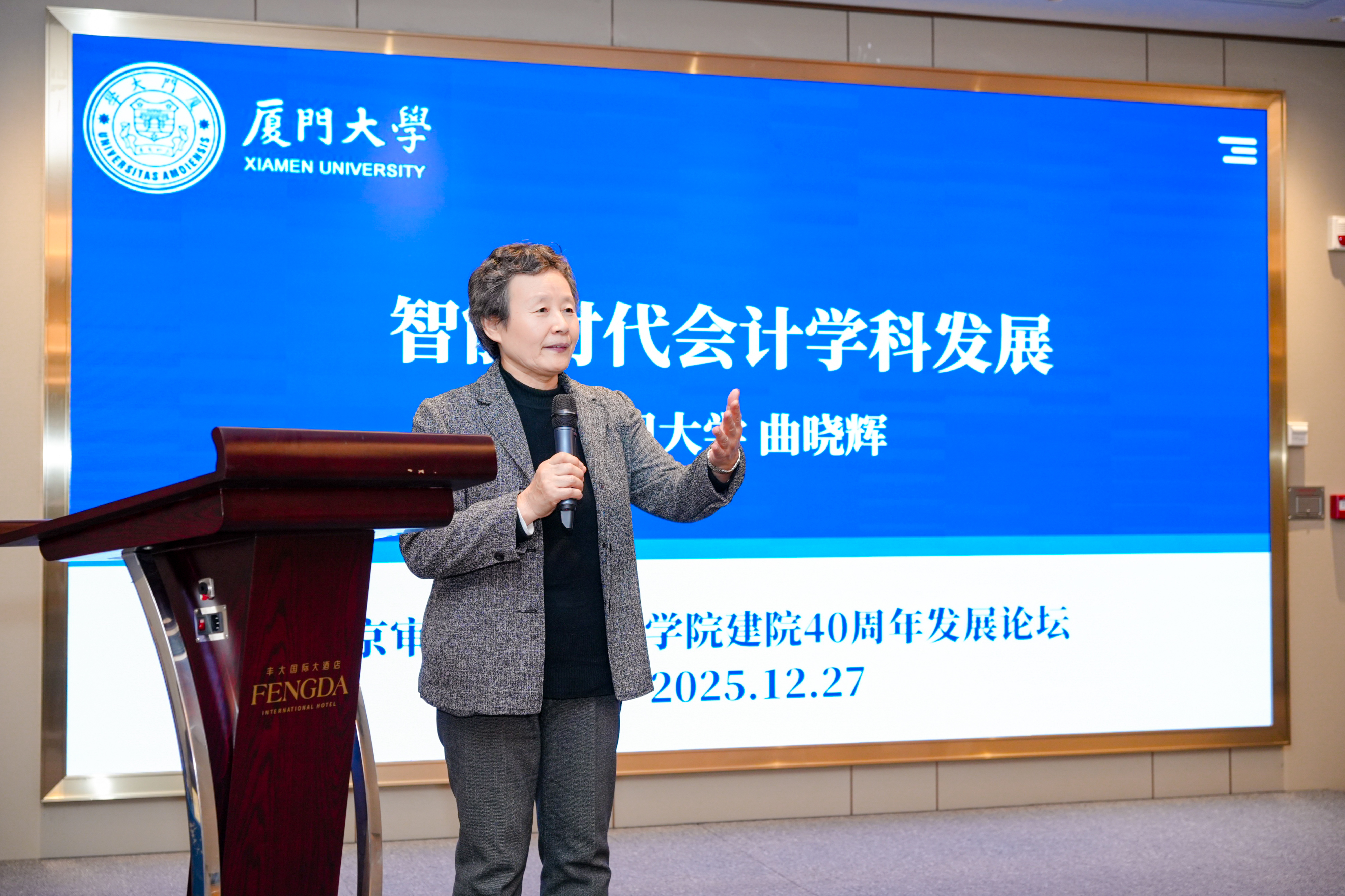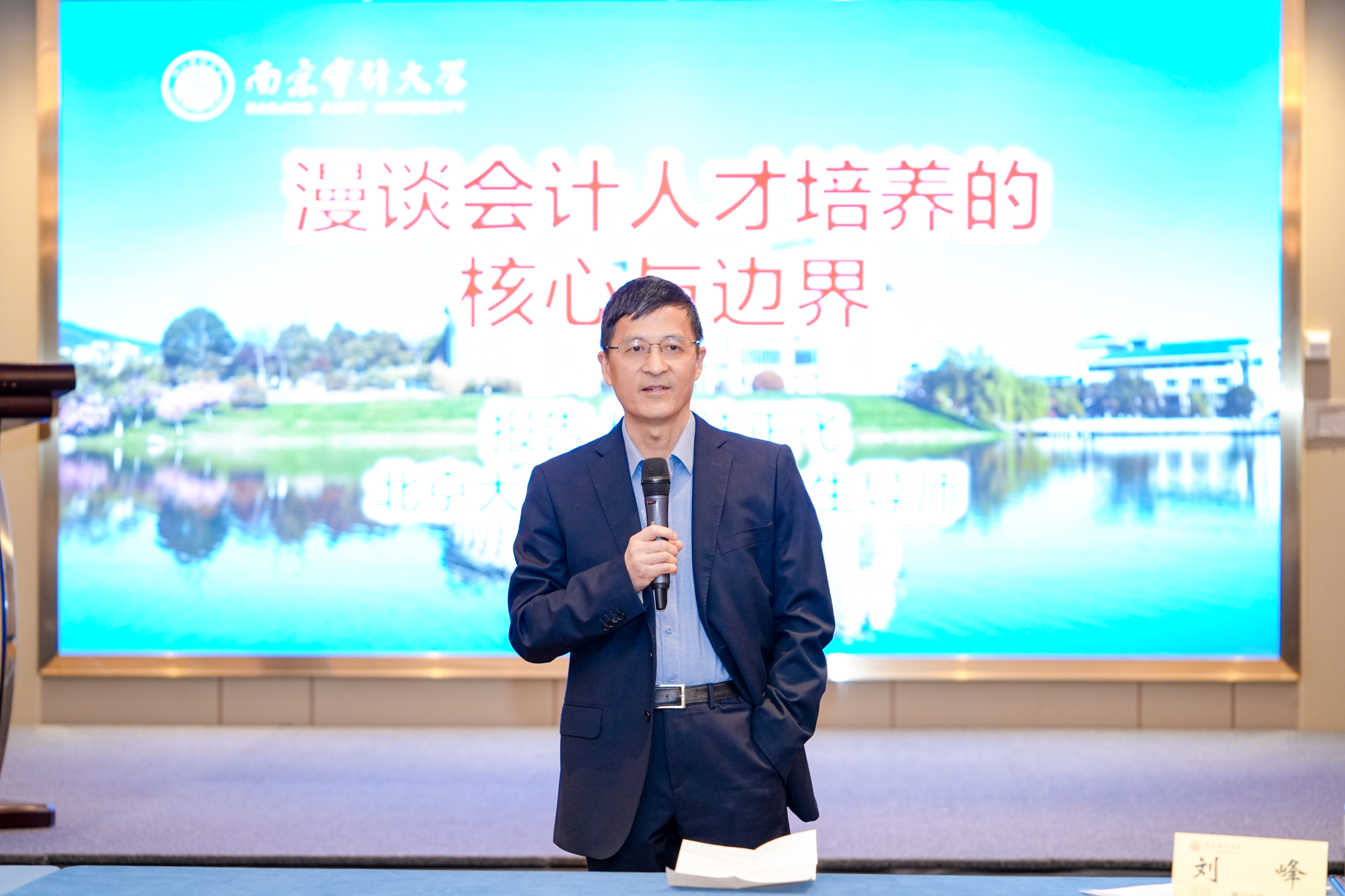 朱元午作“会计数字化与会计本真的坚守”的主题报告。作为南京审计大学会计与统计系首任系主任,朱元武深情回顾了南审会计学院四十年筚路蓝缕的创业历程,从鸡鹅巷简陋校舍到浦口现代化校园,见证学院成长为国内会计教育与科研重镇。面对当今数字化浪潮,他提醒师生:培养数字化会计人才仍需坚守会计本真。惟有不离本真,方能继续登攀。