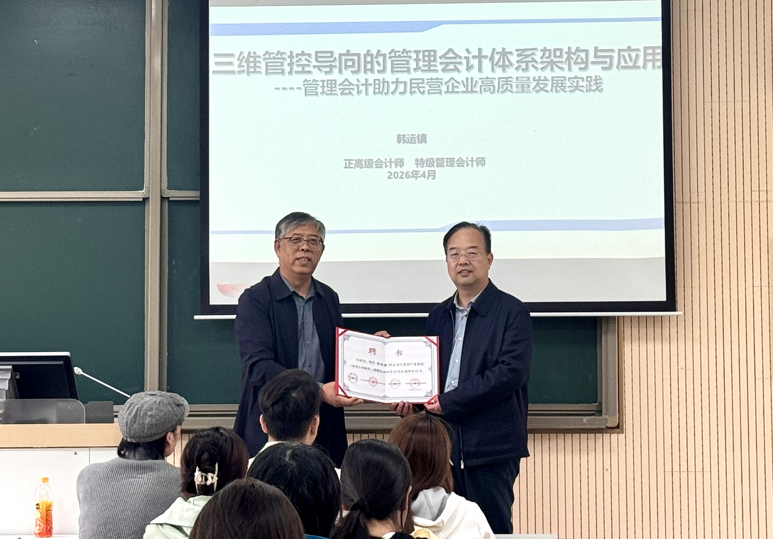 2026年415日,南京审计大学会计学院举办的34期润泽产教融合前沿讲坛”顺利开展。论坛有幸邀请到正高级会计师、特级管理会计师韩运镇作题为“三维管控导向的管理会计体系架构与应用--管理会计助力民营企业高质量发展实践”的专题讲座。讲座由会计学院院长温素彬主持,温素彬院长为韩运镇教授颁发了江苏省产业教授(研究生导师类)证书,会计学院研究生参加讲座。